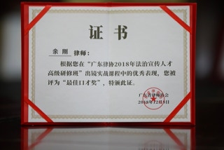 余刚律师获广东省律师协会“最佳口才奖”