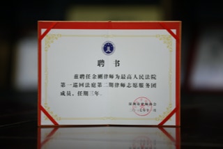 2017年至今获聘为最高人民法院巡回法庭志愿律师。